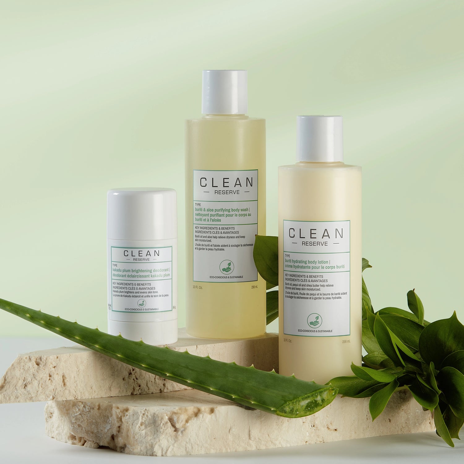 Ingredients and Sustainability: CLEAN RESERVE Buriti & Aloe Purifying Body Wash is crafted with eco-conscious and sustainable buriti oil.